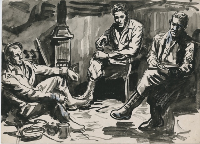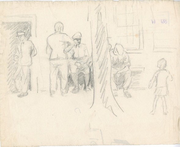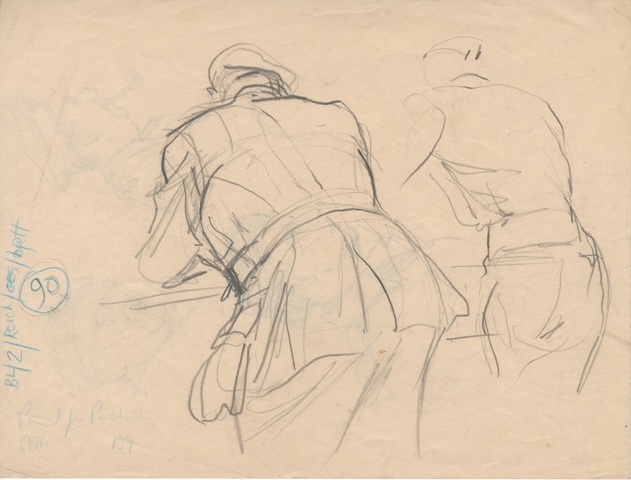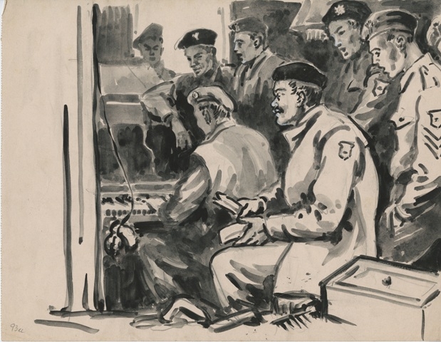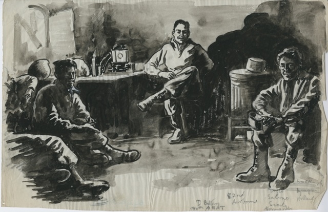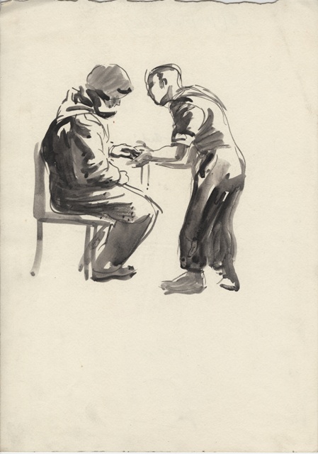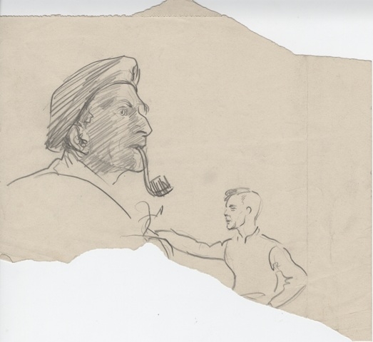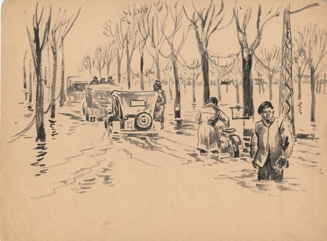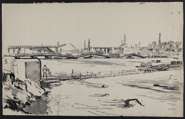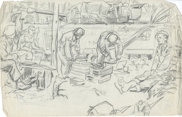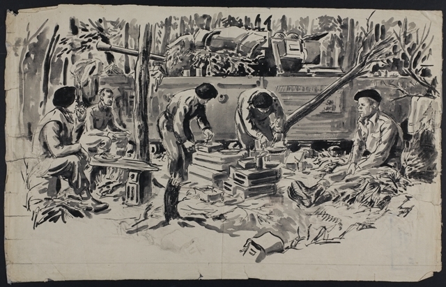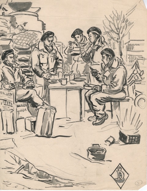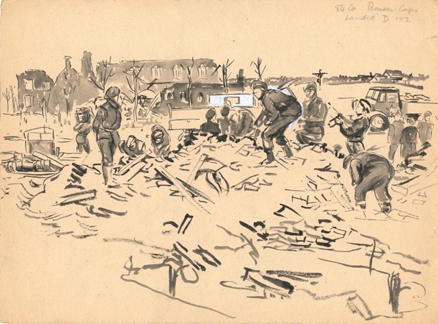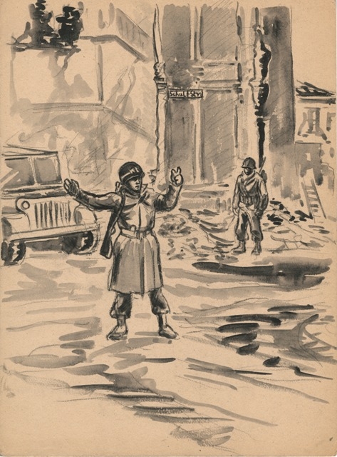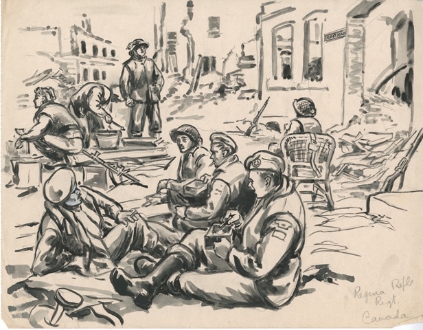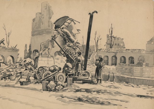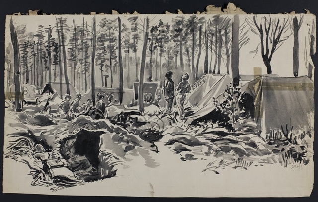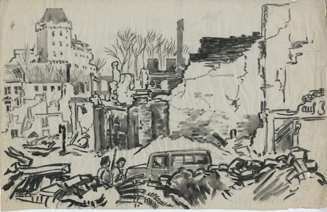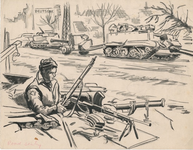 Now I am at the forward Press Camp (at Cuijk) and never have I been anywhere I like better. Women don’t come here and not even many men because it is rather out of touch, being very conveniently close to the fighting. The camp is run by an irresistible Russian major, of great popularity, and an English captain of the most attractive type, consequently it takes its happy tone from them.. Here I seem to have a unique and privileged position and how this has all come about I simply can’t make out and nor can anyone else. All the people in authority know about it and seem to accept it so I suppose it is alright. The British Army has provided me with a jeep and driver and has apparently given me the freedom of the battle front, and also an extension of my visit. I could drive right on the Berlin if I liked and the Germans let me. But I don’t think I will. I spend my days among the soldiers drawing in Cleve, the Reichswald and the battleground villages round about.