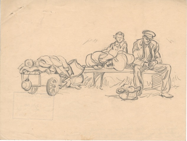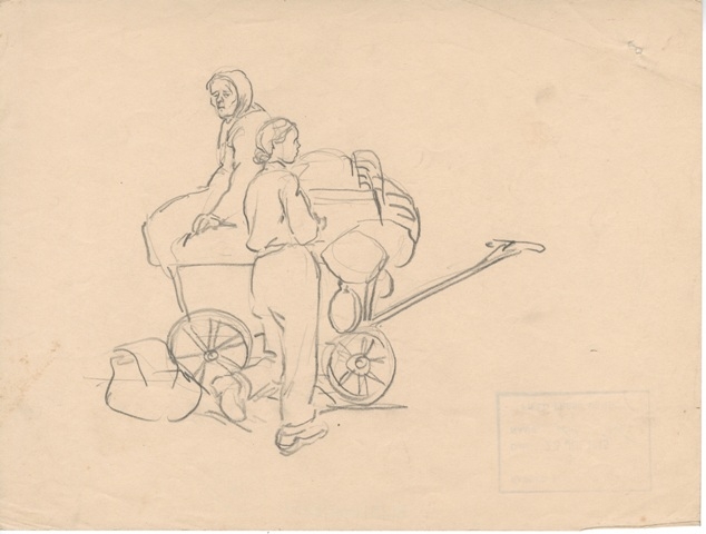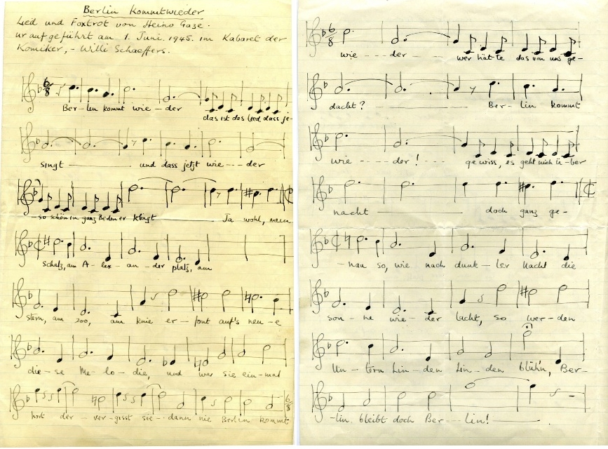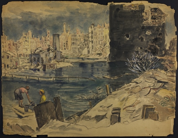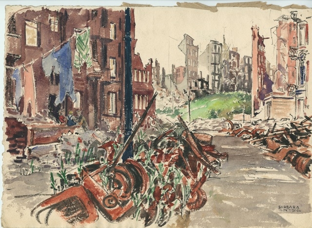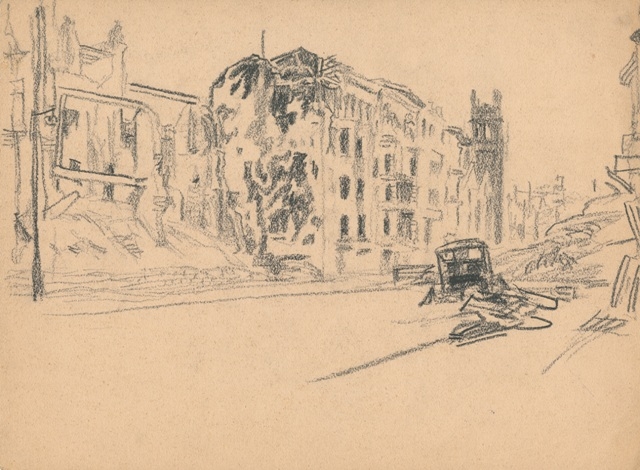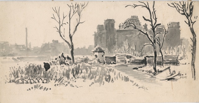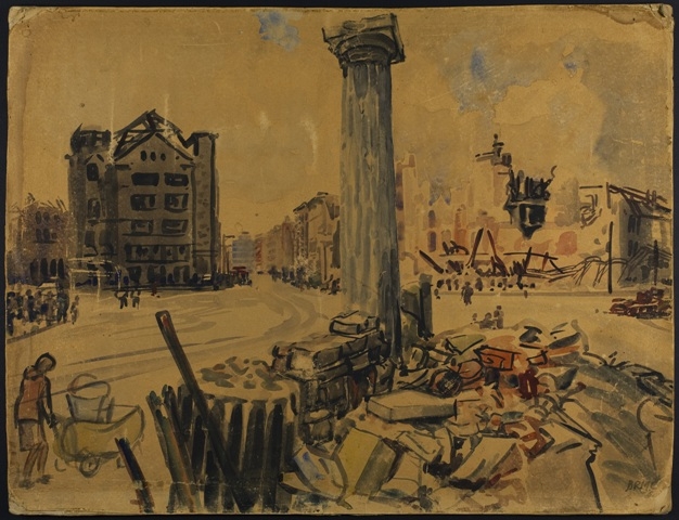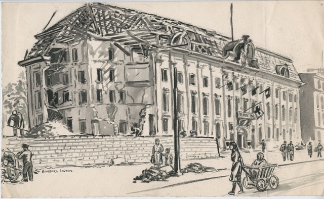 Berlin is very strange. Littered still, wrecked and burnt out cars in the streets, also guns and shot up tanks. Food queues of course and immense bus queues. Limited underground service going only a little way under the earth. Russians in wagons with horses and foals. Russian flag on Reichstag. Bartering on the steps, thick crowds of Russians, Germans, some Americans. Germans offer clothes, shoes, jewellery, books, etc. Seem to get on amicably with Russians, but roughly treated. Tales of rape quite accurate. Girls taken into cellars, made to undress. Brick and bucket parties, women in long lines winding up into the ruins pass along buckets of rubble. Complain that they don’t get promised 75 pfennig per hour. 5 hours daily if they have no regular work – Labour Bureau.